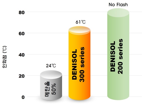 인화점이 아주 높아 위험물에 해당되지 않거나 인화점 측정에 해당되지 않는 No Flash로서 운반, 저장, 취급이 용이하며, 폭발 위험성이 전혀 없어 위험물 관리가 필요 없고, 투자비가 비싼 위험물 시설 투자비가 들지 않습니다.